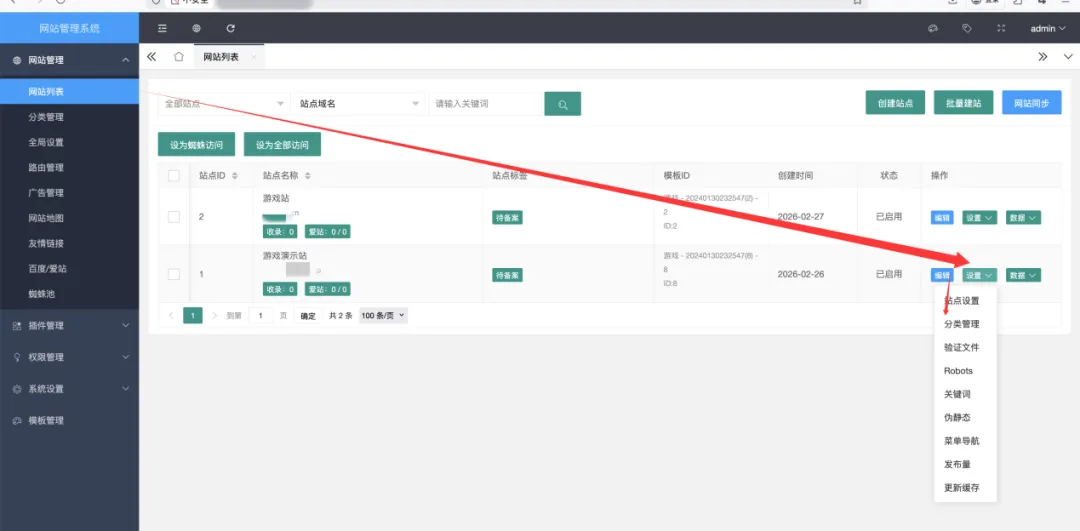 后台->网站管理->网站列表->设置->分类管理->导入手游分类