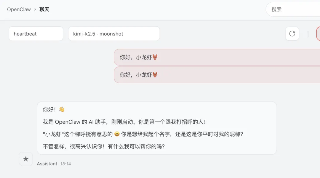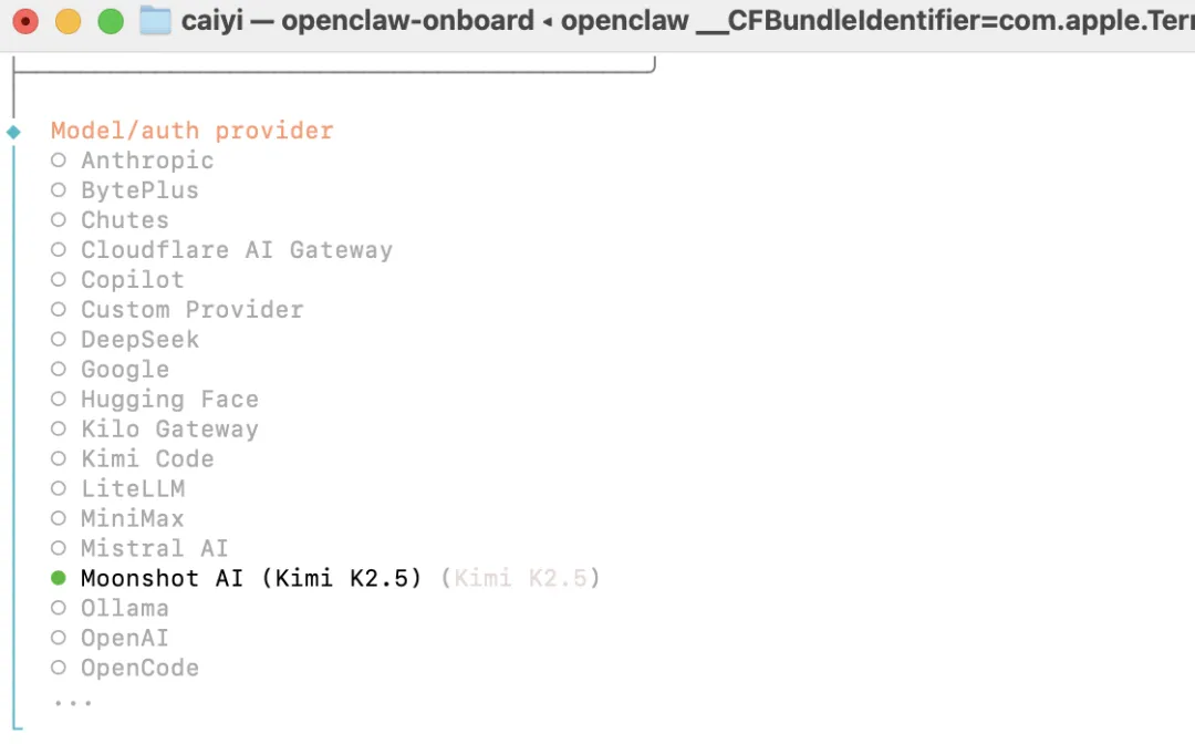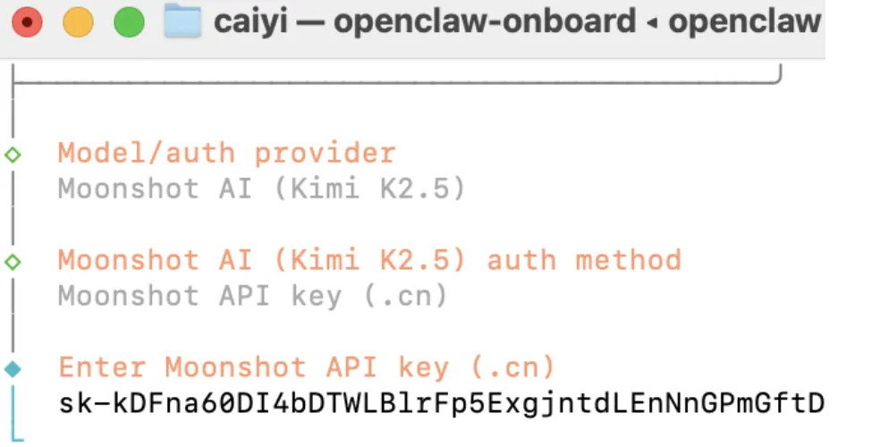 4. 这里选择 kimi 的模型,“MoonShot(Kimi k2.5)”,粘贴API Key5. 配置信息渠道,选择 “Feishu/Lark”,输入飞书自建应用的 APP ID 和 APP SECRET 其余步骤,Skills安装、Hook设置,都可以暂时跳过。先让OpenClaw跑起来(不用担心,后面还可以重新配置)7. 在 https://platform.moonshot.cn 上认证通过后,15 元代金券自动到账,可在「账户总览」查看。再次输入,可以看到成功回复: