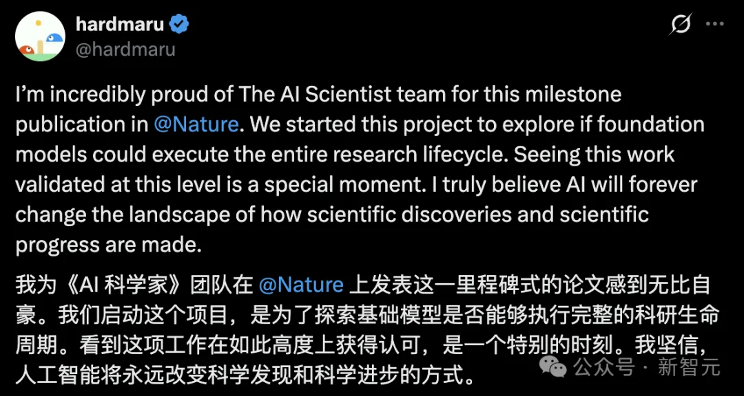 Sakana AI联合创始人兼 CEO David Ha在推文中表示,启动该项目,正是想探索大模型是否能够完成整个科研全流程