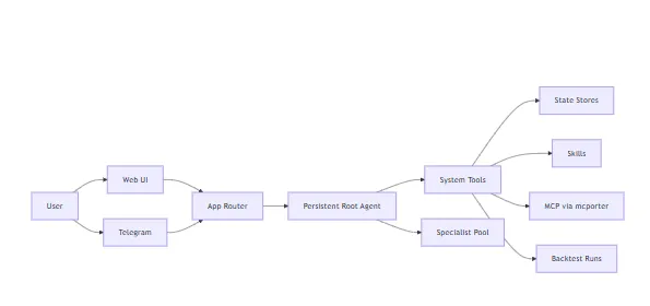 其设计核心遵循 “根智能体主导决策” 的理念:单个持久化根智能体掌控对话与决策流程,仅在领域专家智能体能够为分析 / 交易决策提供有效信号时,才选择性调用该类专家,保障决策效率与精准性;同时,系统规避将特定供应商的市场数据结构硬编码至业务流程,将外部数据访问能力解耦至社区 MCP 服务器和扩展技能(Skills)层,实现核心交易 / 回测逻辑稳定、边缘数据能力灵活扩展的目标。