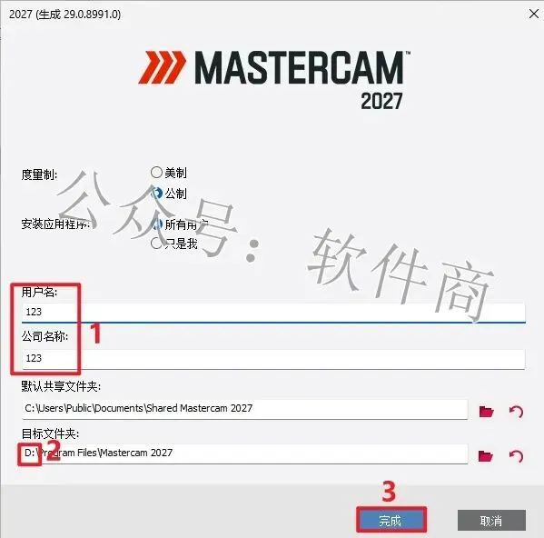 6.用户名和公司名随意输入,将目标文件夹路径中的C改为D(C改为D 表示软件装到D盘)然后点击完成。