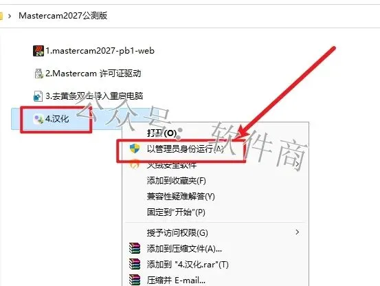 2.打开解压好的文件夹,选中1.mastercam2027....点击鼠标右键选择以管理员身份运行。
