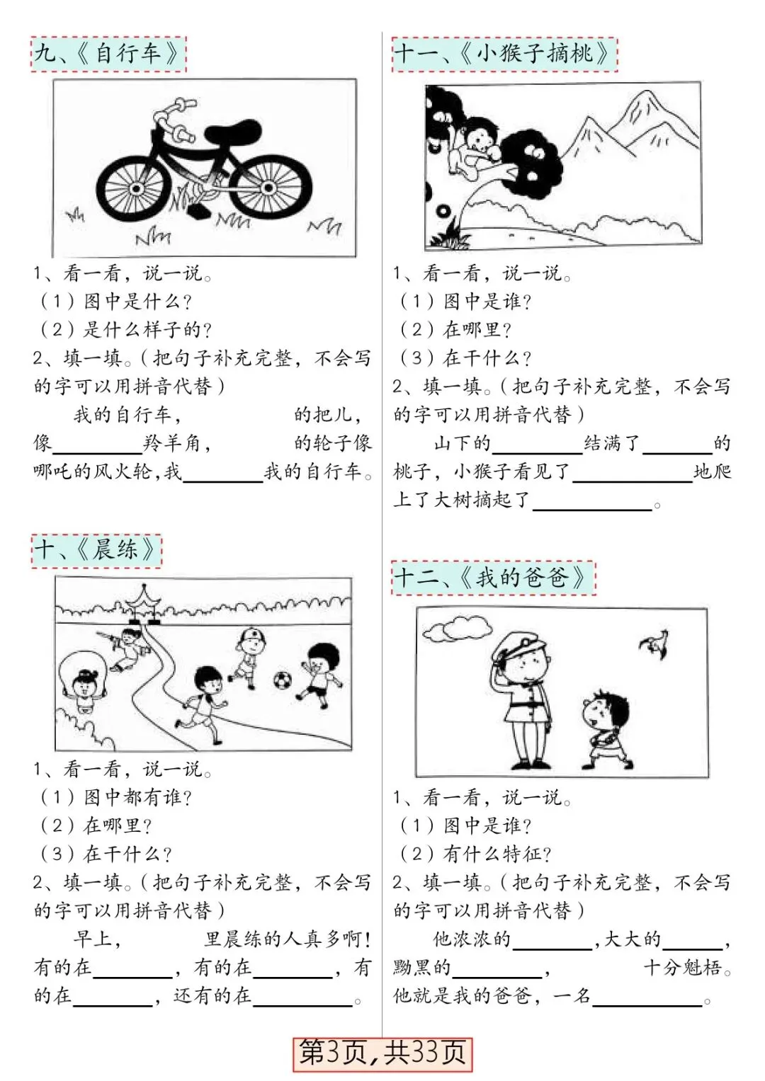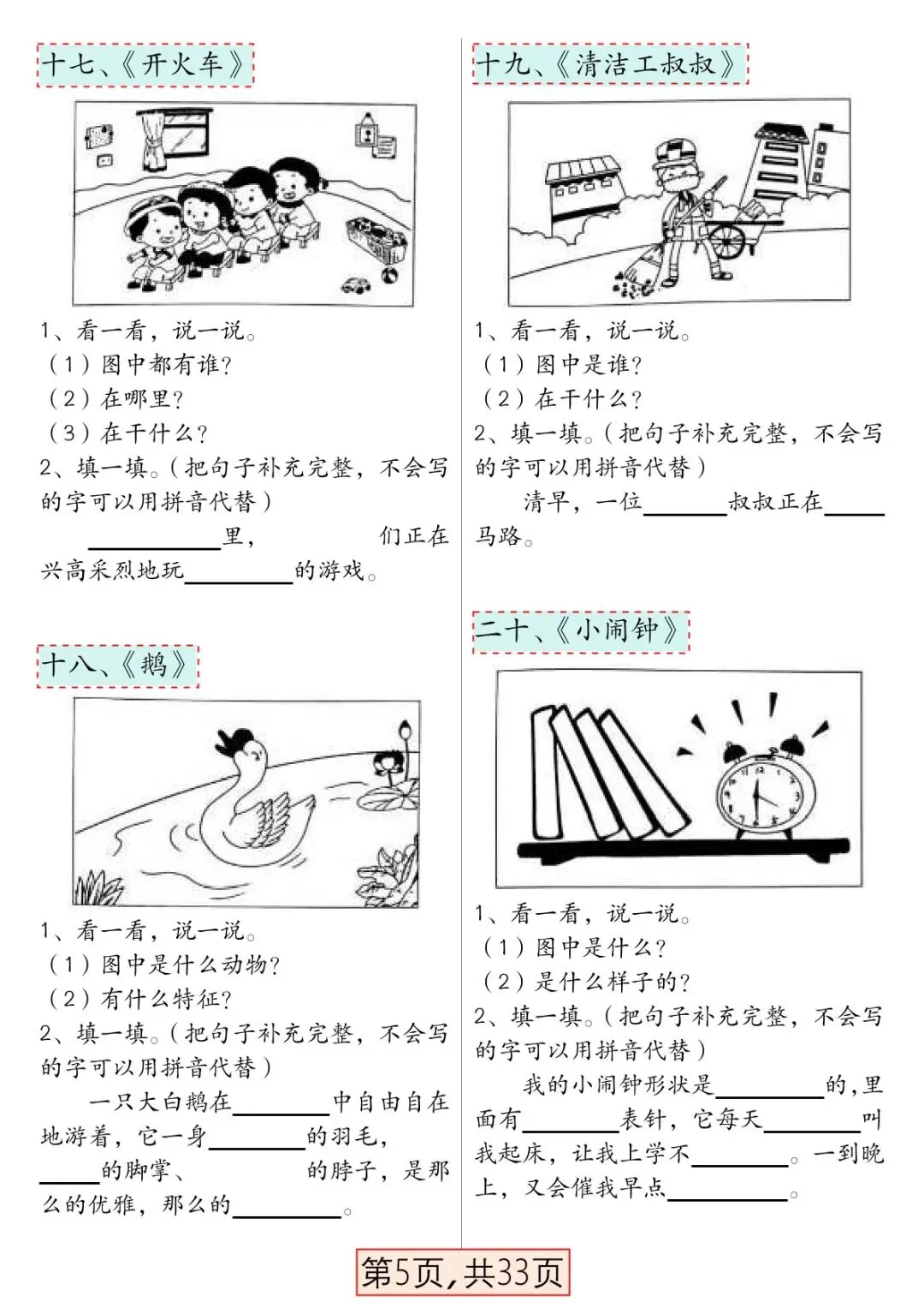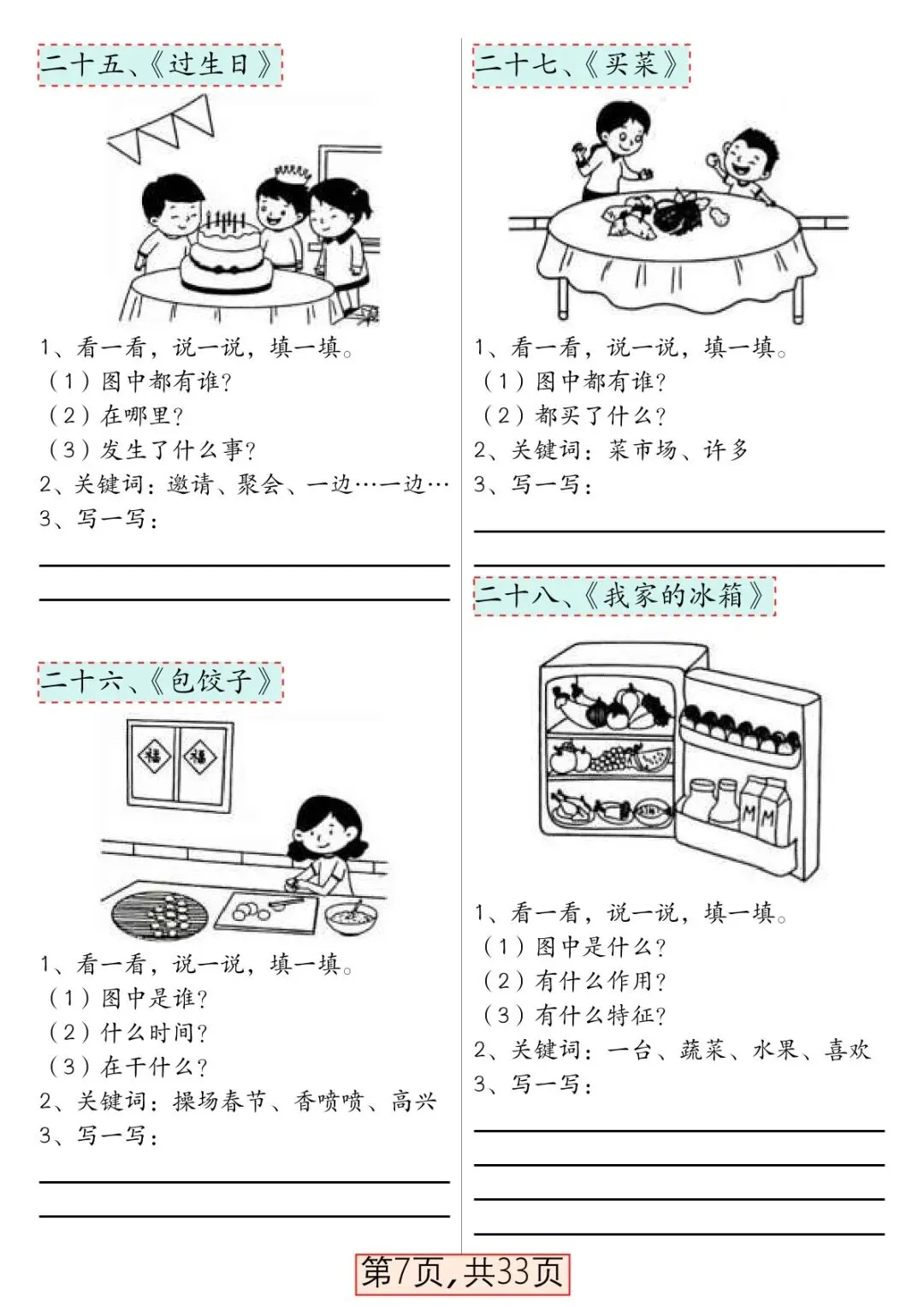 本资料专为一年级下册语文看图写话打造,精选66 篇高频看图写话主题,贴合部编版教材单元习作要求,从一句话→几句话→一段完整话循序渐进,难度适配一年级孩子水平,范文规范、思路清晰、好词好句丰富,可直接打印练习,是一年级学生打好写话基础、提升表达能力的必备专项资料
