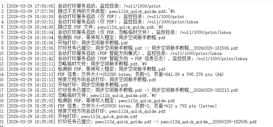 只自动处理 PDF 忽略上传过程中的临时文件 处理完成自动加时间戳归档 支持按文件名控制横向/纵向打印策略 后续还能继续增强日志和排错能力