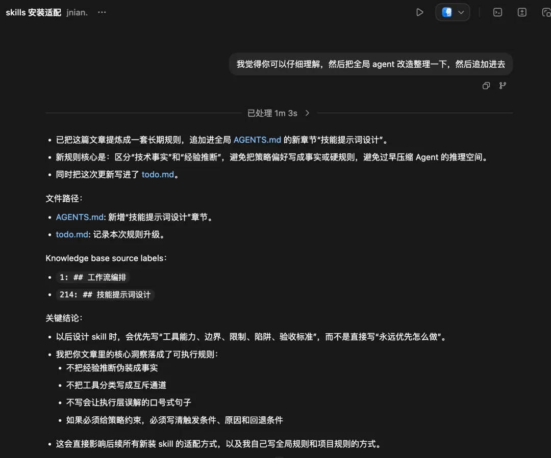 它想了一下,然后自己写了一个 AGENTS.md 文件,把这个 Skill 的说明加进去,告诉自己"下次记得用这个"。