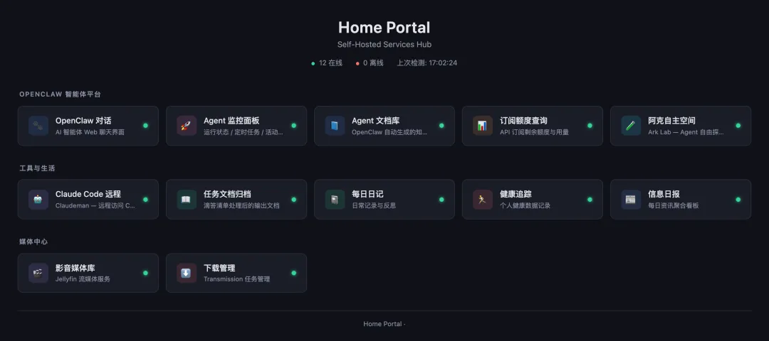 Home Portal 是入口。深色仪表板,卡片网格,每 30 秒探测一次各服务状态。绿色在线,红色异常,点卡片直接跳转。