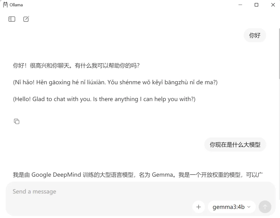这个时候就说明我们已经下载成功了,同时还会显示的Ollama的客户端窗口,这就表示安装已经完成,当前默认会下载几个g的gemma3:4b的默认模型。这就已经代表我们成功安装了Ollama。
