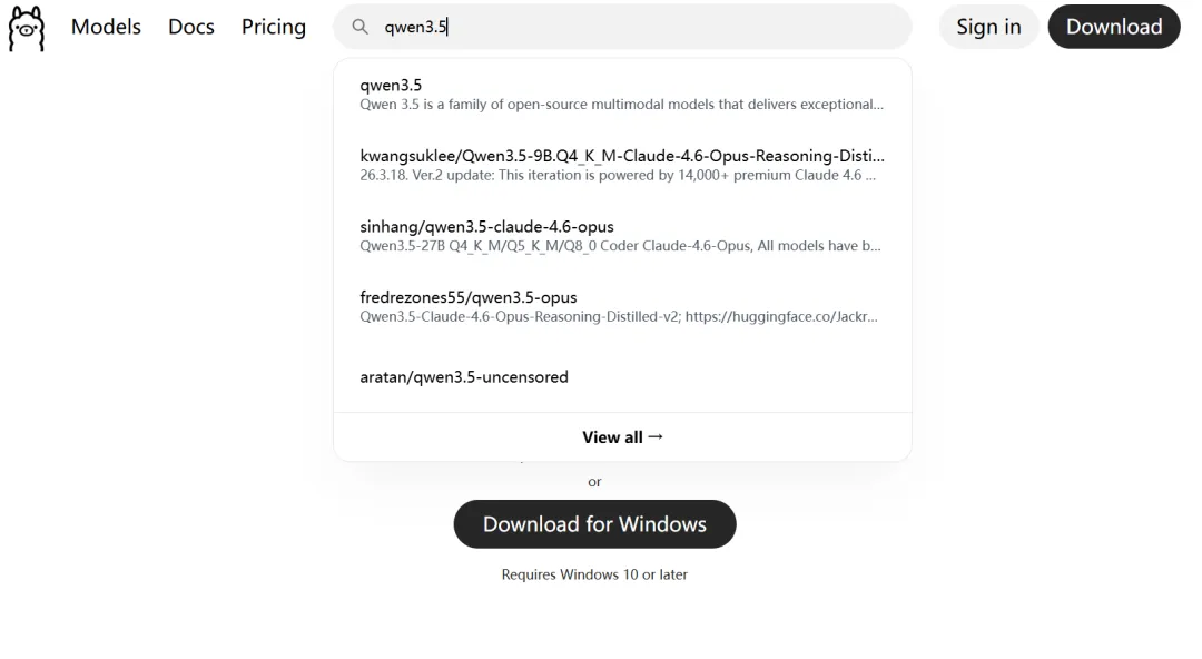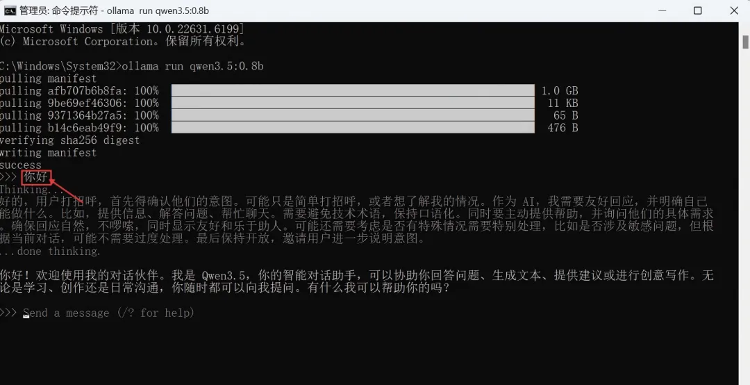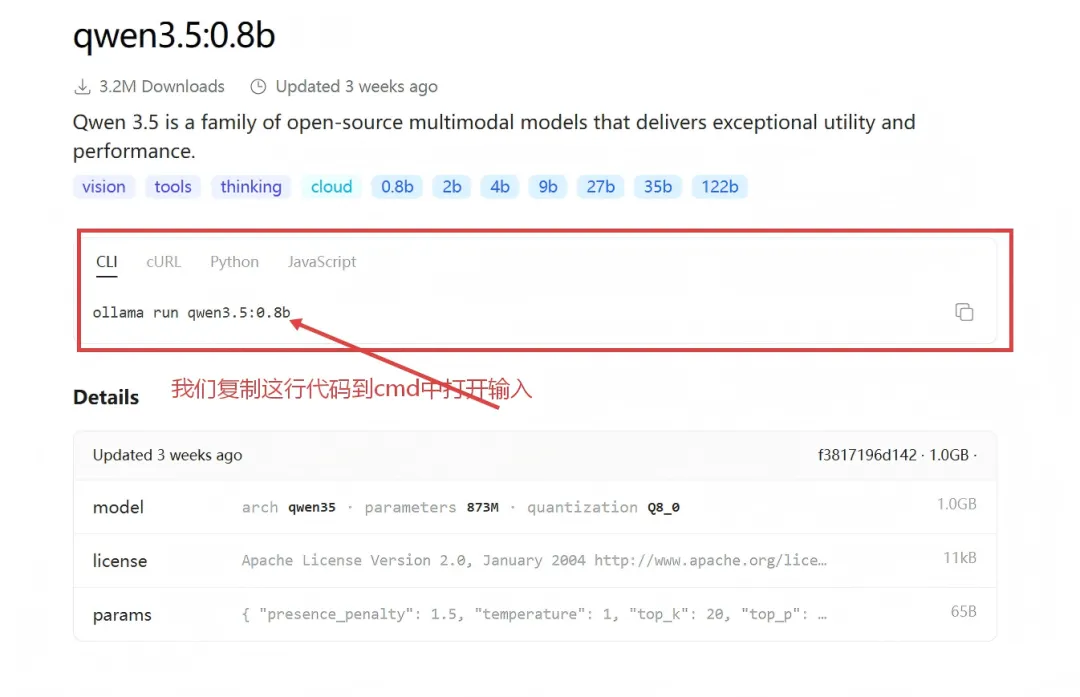 这里我们选择演示下载qwen3.5,0.8b这个版本的,大部分电脑目前都可以轻松带动,这里我个人比较推荐4b的这个版本,能满足一些日常的使用。