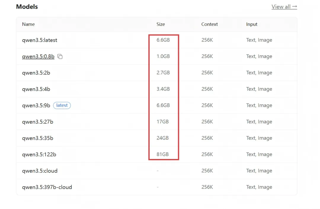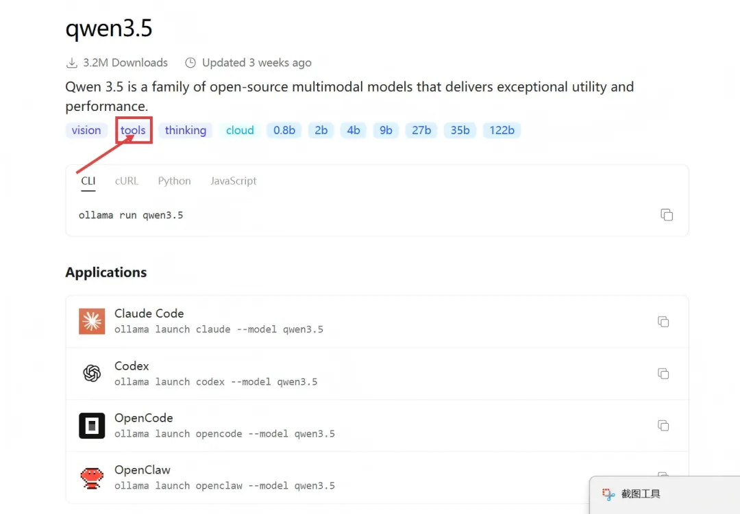 3、大模型版本根据个人需求自由选择,这里如果电脑显卡的配置高我们就可以选择27b甚至是35b和122b(推荐企业级使用),可以在Ollama的官网进行自由选择,也可以在Ollama的客户端端口下载,这里我建议在官网下载,可以清楚的了解我们的需求选择和查看所需的内存,这里我们还需要考虑想要能够和OpenClaw对接的话,模型必须带工具调用功能(必须带tools标签)。