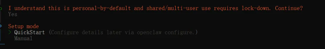 2、接下来看到的是 OpenClaw 安装过程中的配置模式选择界面,在这里跟着我的步骤选择,光标默认选中 QuickStart(快速启动模式,推荐新手)