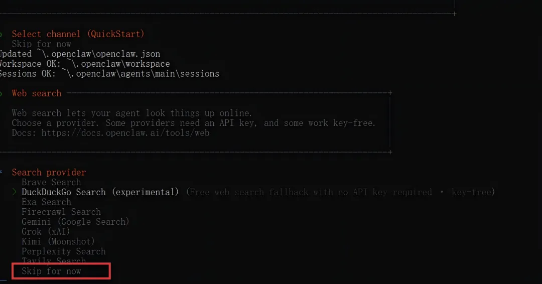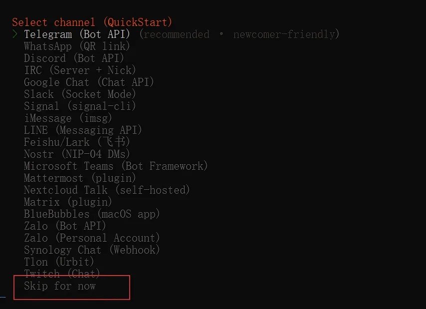 此步骤用于跳过配置聊天渠道,直接完成 OpenClaw 的初始化配置。