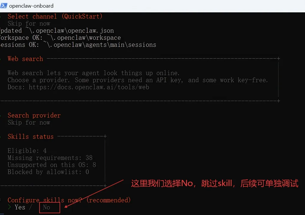 若想后续手动配置技能,选择 No 即可跳过;若需配置,选择 Yes 并按指引操作。