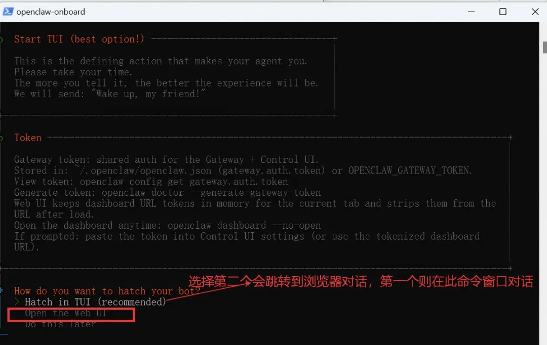 光标默认选中 Hatch in TUI (recommended),这里我们选择第二个按回车键确认。