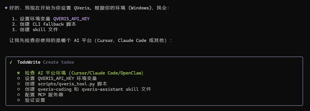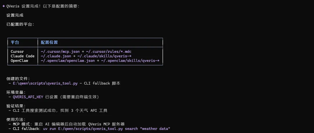 Set up QVeris following https://github.com/QVerisAI/Skill/blob/main/SETUP.md. My api key is sk-4sHcqfmRSLVvGtp8KY6LMS1pYiIFwvPlcS9CORzMmGo查询天气 直接在编程工具中输入