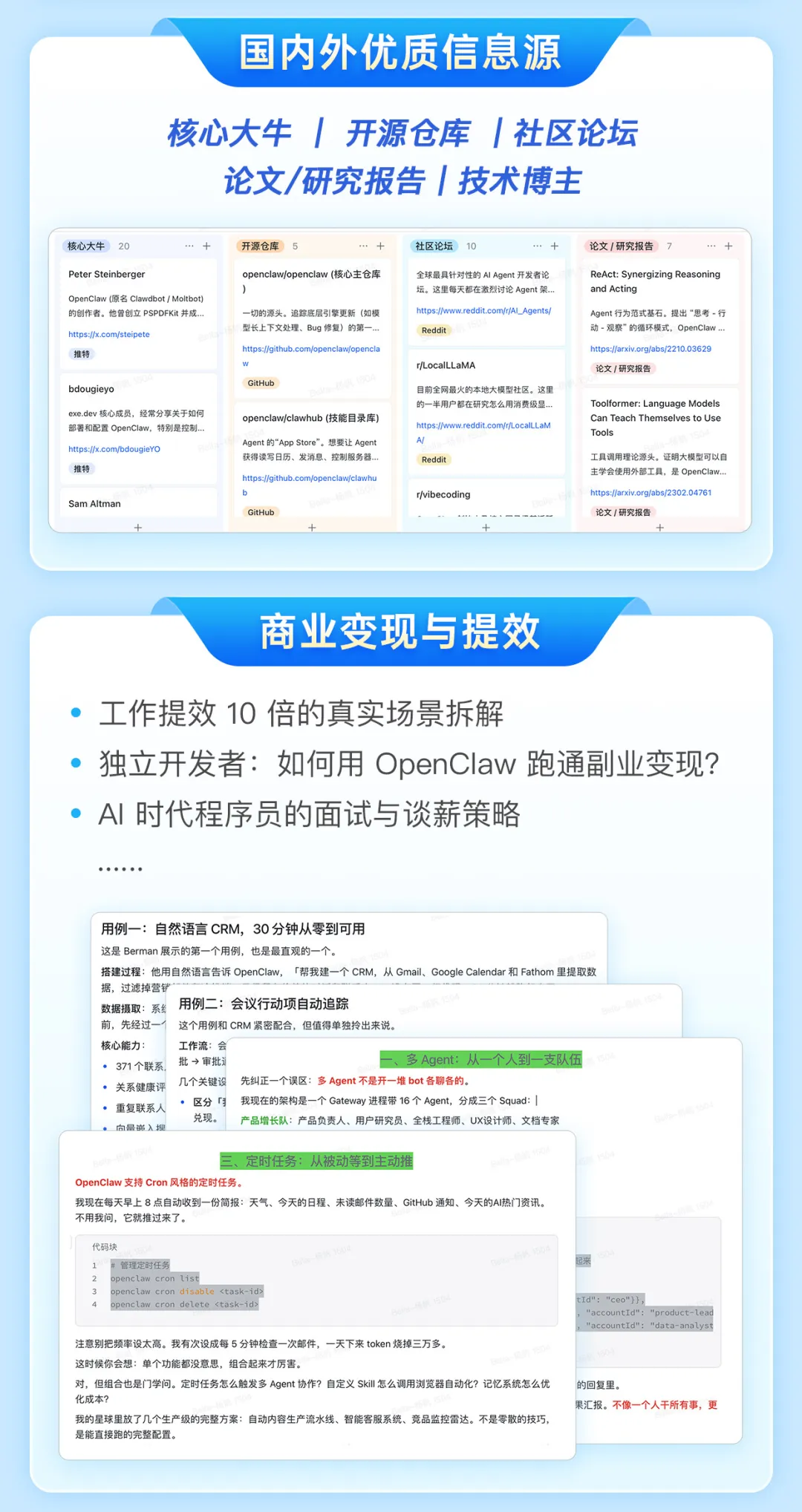 能同时讲清楚 Open Claw 底层原理、部署教程、实战案例、优质信息源、提效 & 变现手段等,这波利好个人的技术浪潮我们可得把握住啊,希望这个资料可以助你一臂之力。