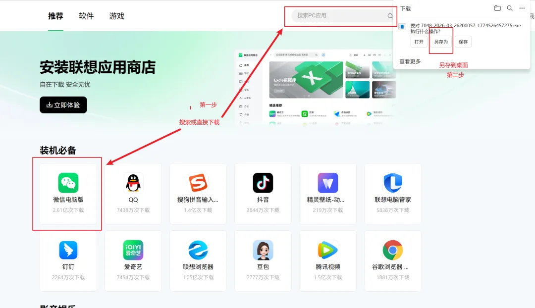 新手小白如何使用电脑——软件安装篇电脑安装软件的时候要做一下相应的设置,否则容易安装到C盘中软件商店的使用,有联想应用商店的可以直接使用,没有的可以使用网页版的(https://lestore.lenovo.com/),本次以下载微信为例1.没有的可以使用网页版的(https://lestore.lenovo.com/)