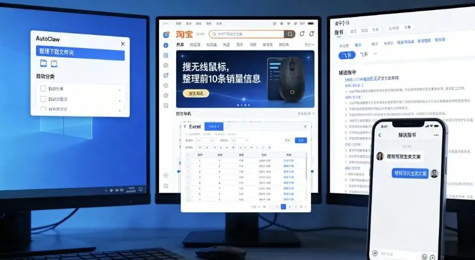 - 浏览器自动干活:“打开淘宝搜无线鼠标,按销量排,抓前10条信息做成表格”,它自动打开浏览器、搜索、翻页、复制、整理