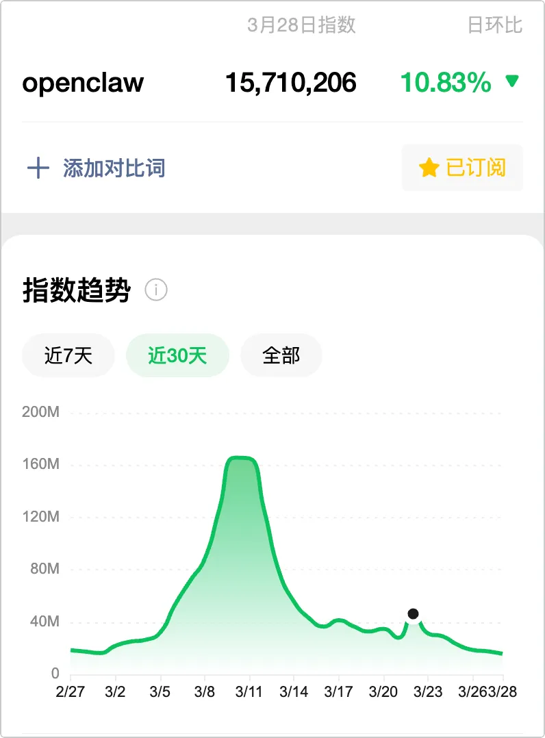 从微信热搜指数来看,OpenClaw 的指数在本月3月8日到3月11日达到最高峰,现在已经回落到平均水平
