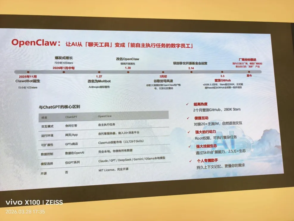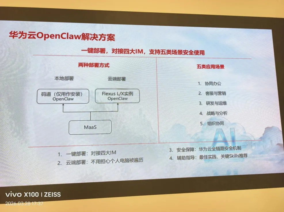 本次华为云OpenClaw线下安全养虾活动,聚焦AI智能体框架部署的安全痛点与落地需求展开。针对OpenClaw这类高执行权限AI框架普遍存在的公网暴露、隐私泄露等安全风险,华为云专项打造了云端安全“养虾池”解决方案,通过专属镜像一键部署能力,让用户无需配置复杂的Node.js环境与依赖项,即可快速完成专属AI智能体的搭建。方案核心采用云端与本地隐私数据物理隔离的架构,搭配从底层平台环境、中层权限管控到顶层应用防护的三层安全体系,既支持DeepSeek-V3.2、GLM-5、Kimi-K2等多款主流大模型的灵活接入,也可实现与飞书、企业微信、钉钉等主流办公平台的无缝对接,同时推出了专属云服务器优惠政策与千万级Token福利,大幅降低了企业与开发者的AI应用落地门槛。
