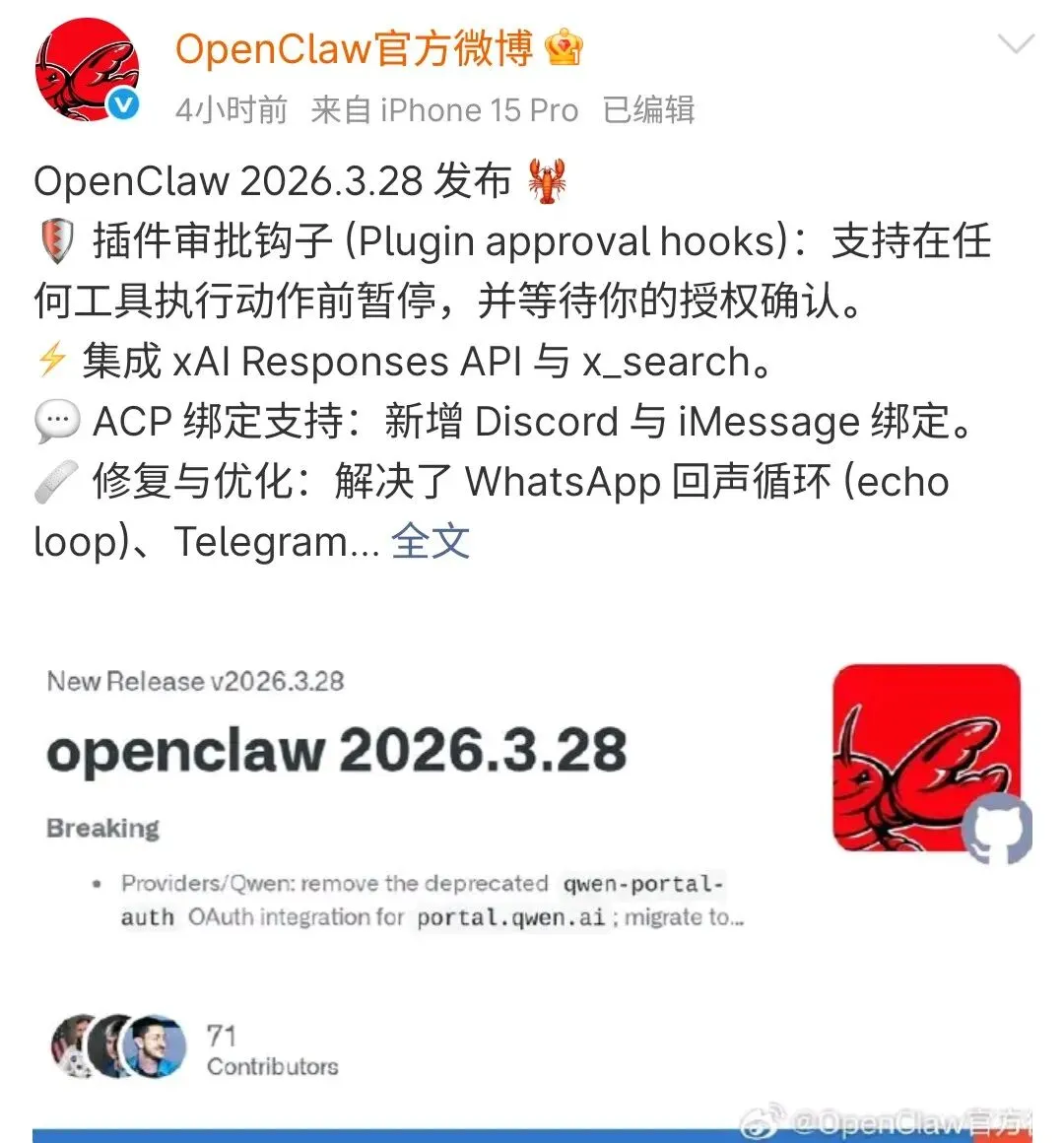 今天,OpenClaw 官方微博公布OpenClaw 2026.3.28 版本正式发布 。