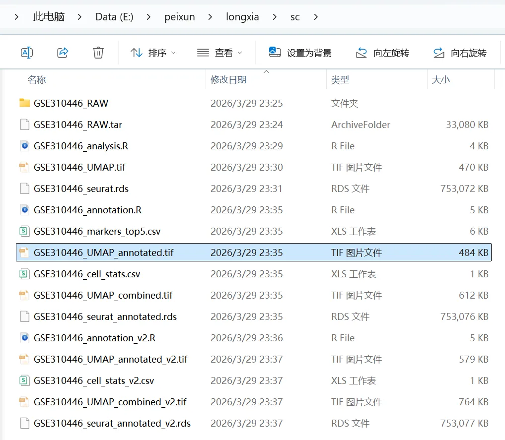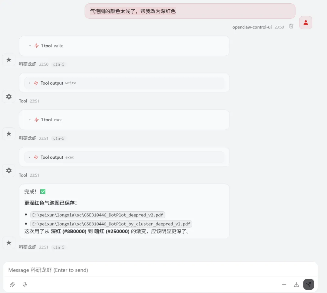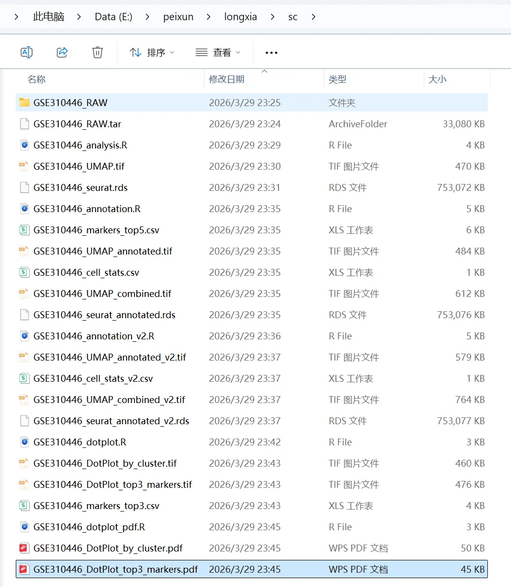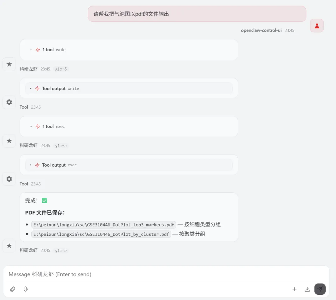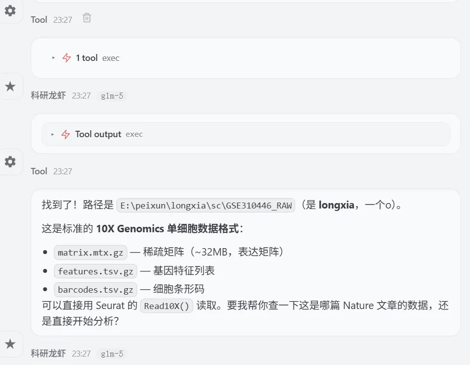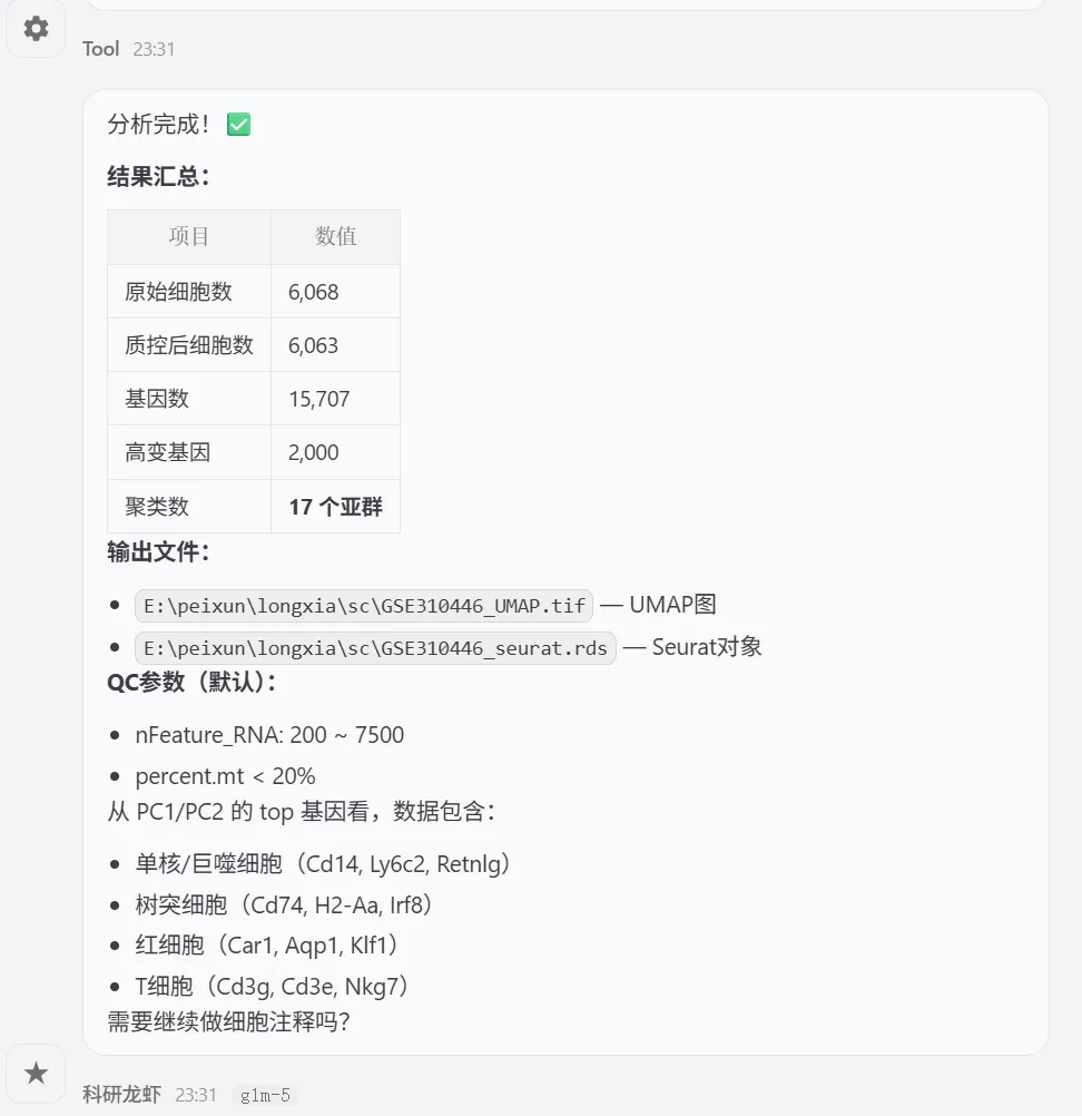 让 Openclaw (小龙虾)来分析单细胞数据,数据来源最新的Nature主刊文章CNS | 参考文献文章数据下载打开 GSE310446选择要下载的数据文件夹展示如下关注公众号,下次完整用龙虾复现nature的空转数据分析1.先告诉龙虾数据,确认数据是否存在指令如下你好 我在电脑的E盘 peixun的文件夹 下面有个loongxia的文件夹, 文件夹中有个sc文件夹, 文件夹中有GSE310446_RAW的文件夹,这个文件夹中的数据是nature文章中下载的单细胞数据,你可以看到吗想系统学习龙虾可以看OpenClaw:给科研人配一个真正能干活的AI智能体小龙虾正确的识别到了单细胞数据的路径(我不小心longxia文件夹多写了一个o ,竟然也可以识别)2.让龙虾读取数据和分析数据请你直接开始分析,首先帮我读取单细胞的数据,然后对单细胞的数据进行指控,指控的参数就按照常规的默认参数就可以,接下来对数据进行降维聚类,最后进行umap的展示,展示的图要保存为tif想系统学习龙虾可以看OpenClaw:给科研人配一个真正能干活的AI智能体我们去查看一下 umap有没有做好聚类后的umap图结果展示关注公众号,下次完整用龙虾复现nature的空转数据分析3.注释单细胞数据需要进行注释想系统学习龙虾可以看OpenClaw:给科研人配一个真正能干活的AI智能体查看文件夹结果注释的结果展示关注公众号,下次完整用龙虾复现nature的空转数据分析4.marker基因的气泡图展示 帮我展示top3的marker基因,并且用气泡图进行展示,气泡图的颜色要求是红色让龙虾给我pdf的图片结果输出了好多文件,包括代码和rdata的数据marker基因的气泡图展示结果关注公众号,下次完整用龙虾复现nature的空转数据分析气泡图的颜色太浅了,帮我改为深红色改完颜色的marker基因展示如下关注公众号,下次完整用龙虾复现nature的空转数据分析想系统学习龙虾可以看OpenClaw:给科研人配一个真正能干活的AI智能体欢迎加入CNS生信交流群一起讨论与研究时下热门CNS文章各类生信分析方法(若二维码过期可以添加微信:huagesx)孟德尔+单细胞全文复现孟德尔+单细胞全文复现(纯生信公共数据挖掘)零基础想学生信,看👇这个文章:零基础也能学的AI生信课(AI助力生信入门班即将开始)想学机器学习,看👇这个文章:AI助力多组学与机器学习联合分析(机器学习分析代谢组、蛋白组、宏基因组、网络药理学、转录组)想系统学单细胞,看👇这个文章:CNS文章单细胞数据分析内容汇总(基础--进阶--python分析)想系统学空间转录组,看👇这个文章:Nature单细胞空间组学1:1复现训练营跟着CNS文章学空间转录组分析线上直播课(Visium HD、Xenium、Stereo-seq)欢迎关注 | 华哥科研平台亲,写的这么辛苦,记得关注、点赞、转发哟!