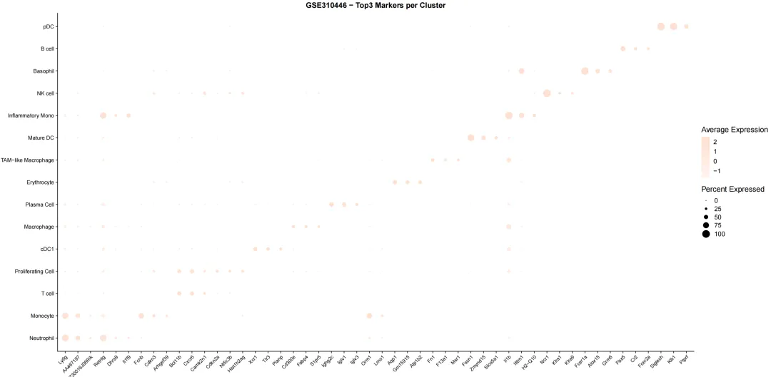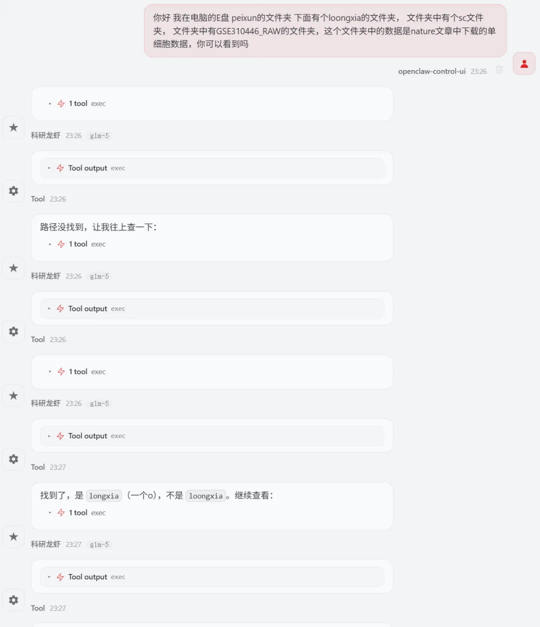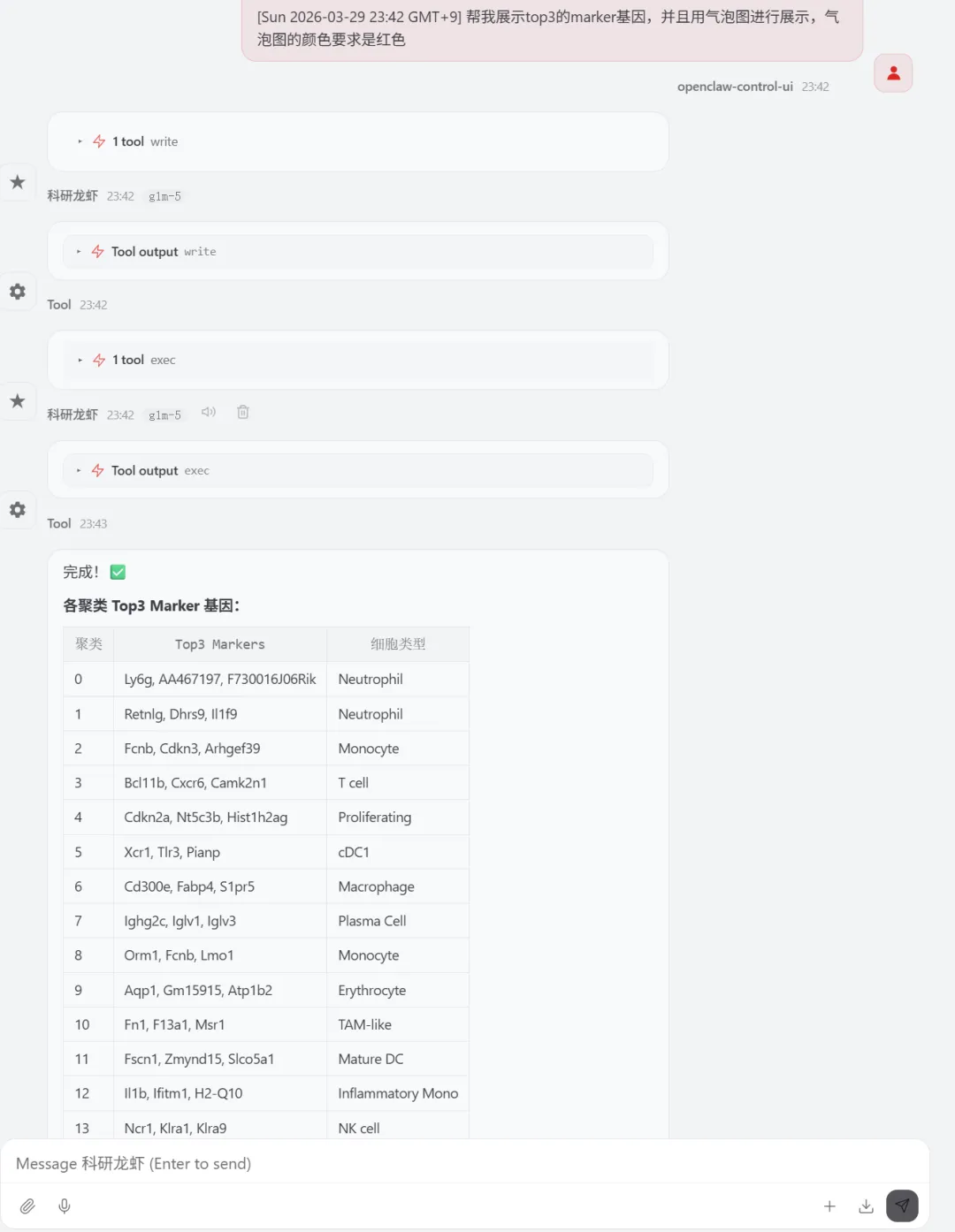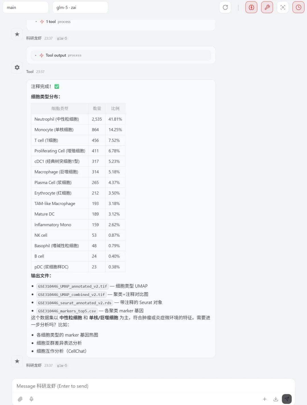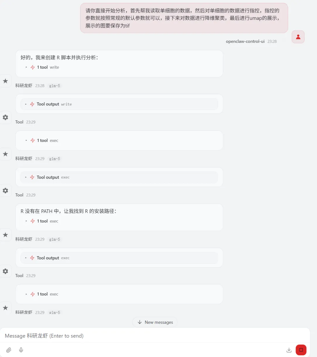 让 Openclaw (小龙虾)来分析单细胞数据,数据来源最新的Nature主刊文章CNS | 参考文献文章数据下载打开 GSE310446选择要下载的数据文件夹展示如下关注公众号,下次完整用龙虾复现nature的空转数据分析1.先告诉龙虾数据,确认数据是否存在指令如下你好 我在电脑的E盘 peixun的文件夹 下面有个loongxia的文件夹, 文件夹中有个sc文件夹, 文件夹中有GSE310446_RAW的文件夹,这个文件夹中的数据是nature文章中下载的单细胞数据,你可以看到吗想系统学习龙虾可以看OpenClaw:给科研人配一个真正能干活的AI智能体小龙虾正确的识别到了单细胞数据的路径(我不小心longxia文件夹多写了一个o ,竟然也可以识别)2.让龙虾读取数据和分析数据请你直接开始分析,首先帮我读取单细胞的数据,然后对单细胞的数据进行指控,指控的参数就按照常规的默认参数就可以,接下来对数据进行降维聚类,最后进行umap的展示,展示的图要保存为tif想系统学习龙虾可以看OpenClaw:给科研人配一个真正能干活的AI智能体我们去查看一下 umap有没有做好聚类后的umap图结果展示关注公众号,下次完整用龙虾复现nature的空转数据分析3.注释单细胞数据需要进行注释想系统学习龙虾可以看OpenClaw:给科研人配一个真正能干活的AI智能体查看文件夹结果注释的结果展示关注公众号,下次完整用龙虾复现nature的空转数据分析4.marker基因的气泡图展示 帮我展示top3的marker基因,并且用气泡图进行展示,气泡图的颜色要求是红色让龙虾给我pdf的图片结果输出了好多文件,包括代码和rdata的数据marker基因的气泡图展示结果关注公众号,下次完整用龙虾复现nature的空转数据分析气泡图的颜色太浅了,帮我改为深红色改完颜色的marker基因展示如下关注公众号,下次完整用龙虾复现nature的空转数据分析想系统学习龙虾可以看OpenClaw:给科研人配一个真正能干活的AI智能体欢迎加入CNS生信交流群一起讨论与研究时下热门CNS文章各类生信分析方法(若二维码过期可以添加微信:huagesx)孟德尔+单细胞全文复现孟德尔+单细胞全文复现(纯生信公共数据挖掘)零基础想学生信,看👇这个文章:零基础也能学的AI生信课(AI助力生信入门班即将开始)想学机器学习,看👇这个文章:AI助力多组学与机器学习联合分析(机器学习分析代谢组、蛋白组、宏基因组、网络药理学、转录组)想系统学单细胞,看👇这个文章:CNS文章单细胞数据分析内容汇总(基础--进阶--python分析)想系统学空间转录组,看👇这个文章:Nature单细胞空间组学1:1复现训练营跟着CNS文章学空间转录组分析线上直播课(Visium HD、Xenium、Stereo-seq)欢迎关注 | 华哥科研平台亲,写的这么辛苦,记得关注、点赞、转发哟!