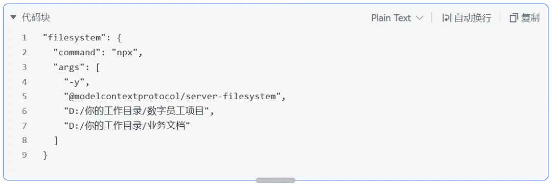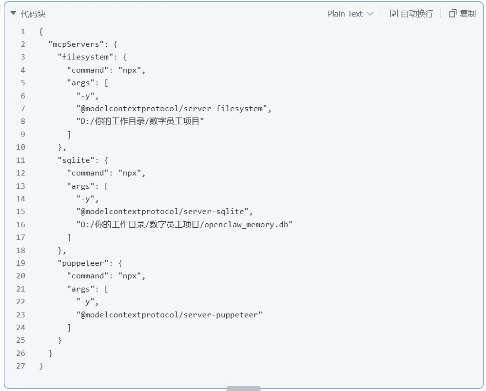 🎯 什么时候用:当你想让 AI 直接读取你电脑里的项目文档、代码片段、归档资料时。 💡棒棒虾大白话:既然云端大模型碰不到你的硬盘,这个 MCP 就是专门给它开的一扇安全门。配置好你指定的绝对路径后,AI 就能在这个允许的范围内帮你找文件、做总结了,这是数字员工干实事的唯一桥梁。 💻傻瓜化保姆级配置: 不需要额外安装软件,只要电脑有 Node.js 环境(带有 npx ),把下面这段直接贴进配置文件的 mcpServers层级下就行: JSON