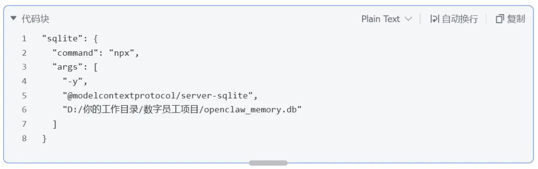🎯 什么时候用:想让 AI 把每天分析的结果、任务日志有条理地存起来,随时调用的场景。 💡棒棒虾大白话:这是一个轻量级的本地数据库。通过它,数字员工就能拥有自己的“结构化长期记忆”,把你每天跑出来的碎片化对话,变成有价值的历史数据沉淀在你的本地。 💻傻瓜化保姆级配置: JSON
