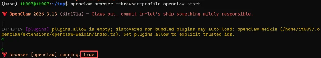 当我们安装浏览器后,OpenClaw会负责浏览器接入、配置和路由,laywright 负责执行很多具体自动化动作,而底层浏览器通信协议是走 CDP,这样就形成了 Linux 系统上的浏览器自动化。