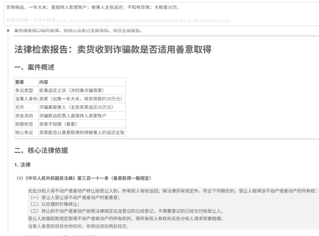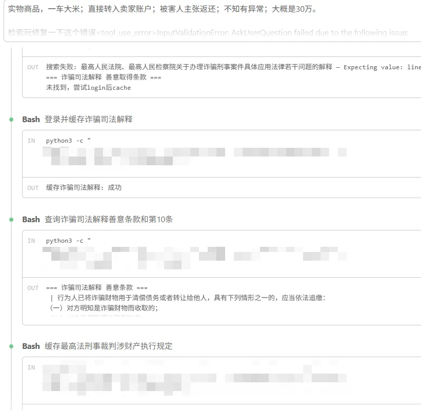 如果没有相关的案子,Claude还会调用在线法律数据库,直接去搜索,存到本地数据库,以方便下次调用。