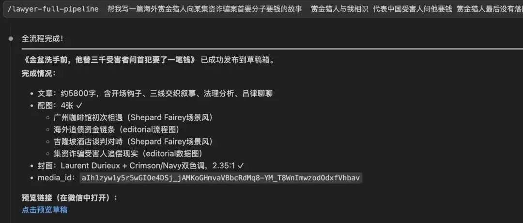 先用 Gemini Deep Research 做一次调研,案例细节、数据来源、法律要点搜集齐全,再让 Claude 按我公众号的写作风格生成文章,过一遍去AI化处理,自动配 3-5 张插图,生成宽幅封面图,最后调微信 API 推送到草稿箱,然后给我发预览链接。