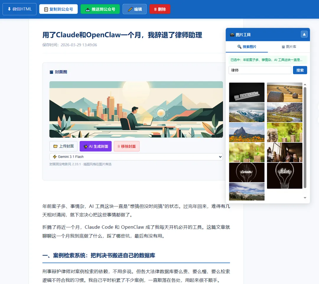 Claude 写完文章推送过来,我在网页上配图、调整,再发布。右侧有个浮动面板,选中文章里的关键词就能直接搜图,看到合适的点一下,图片自动传到微信 CDN 并插入段落。不想手动找的时候,让 Gemini 直接生成也行。现在运营了几个公众号,这套系统多账号都支持,推送的时候选一下就好。