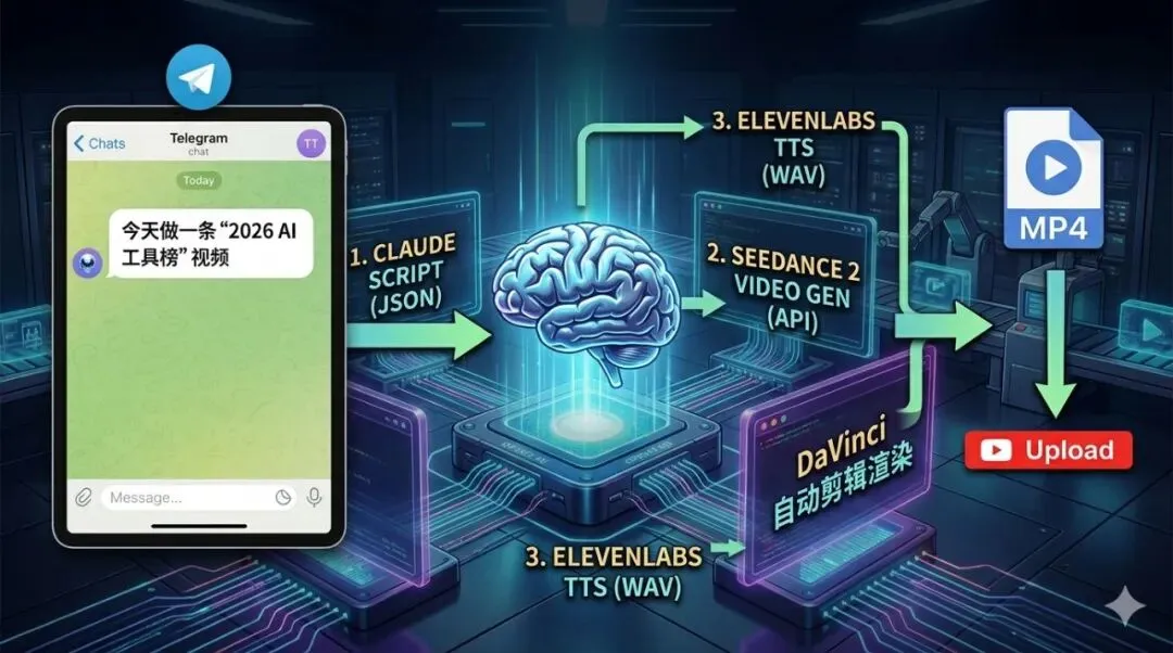它通过 Telegram/WhatsApp 等聊天界面接收你的指令(例如:“今天做一条‘2026 AI 工具榜’视频”),然后: