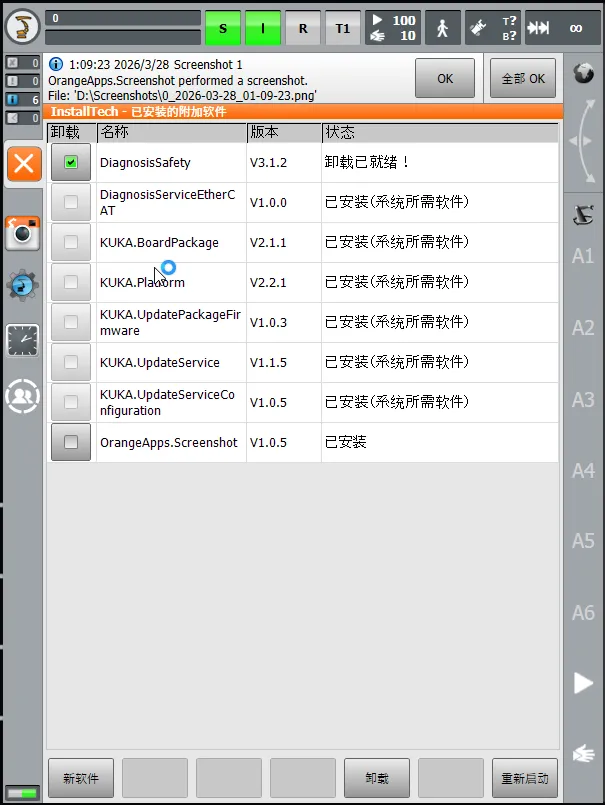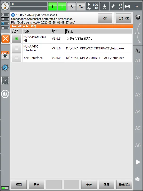 点击左下角的 “新软件” 按钮,系统会自动扫描 D:\KUKA_OPT 目录。在弹出列表中勾选你要安装的软件包,然后点击底部菜单的 “安装”。 - 确认重启: