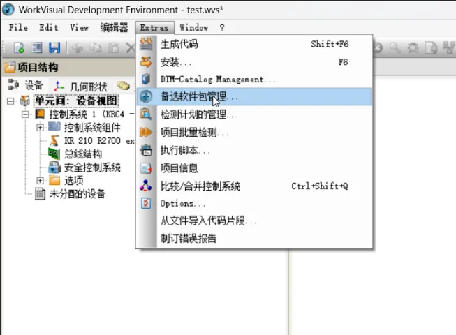 打开 WorkVisual,进入 工具->备选软件包管理。点击“安装”,选择你从库卡官方获取的 .kop格式软件包文件进行安装。安装后,在创建或打开项目时,就能在可用软件包列表中看到并勾选它了。