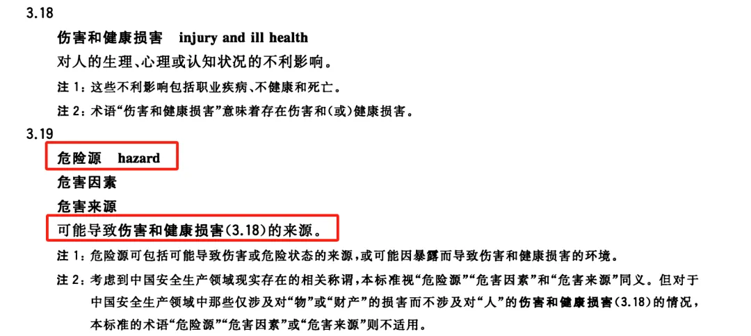 该标准重点阐释了危险源是仅针对关注“人”的伤害和健康损害的情况,重点强调了一个主体,即:以“人”为核心,如相关危害因素仅对“物”或“财产”产生损害,则不适用危险源的这一定义。强调危险源是管理体系需要识别和控制的对象。