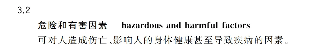 该标准危险和有害因素的定义与《职业健康安全管理体系要求》中危险源的定义基本相同。该标准强调了危险源是可能导致伤害或损害的潜在来源和现实状态。
