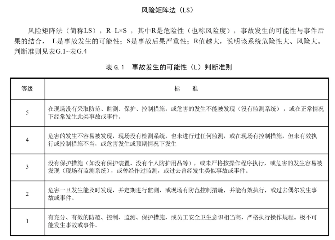 1.上述可能性与严重性的分概念程度判定即风险矩阵分析法 (LS),主要用于对风险等级进行有效判定,根据不同风险等级确定相应的管控措施,具体分析方法如下所示: