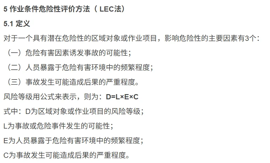 2.另外一种常用的风险等级判定方法为作业条件危险性评价(LEC法),重点进行作业风险等级判定,具体分析方法如下所示: