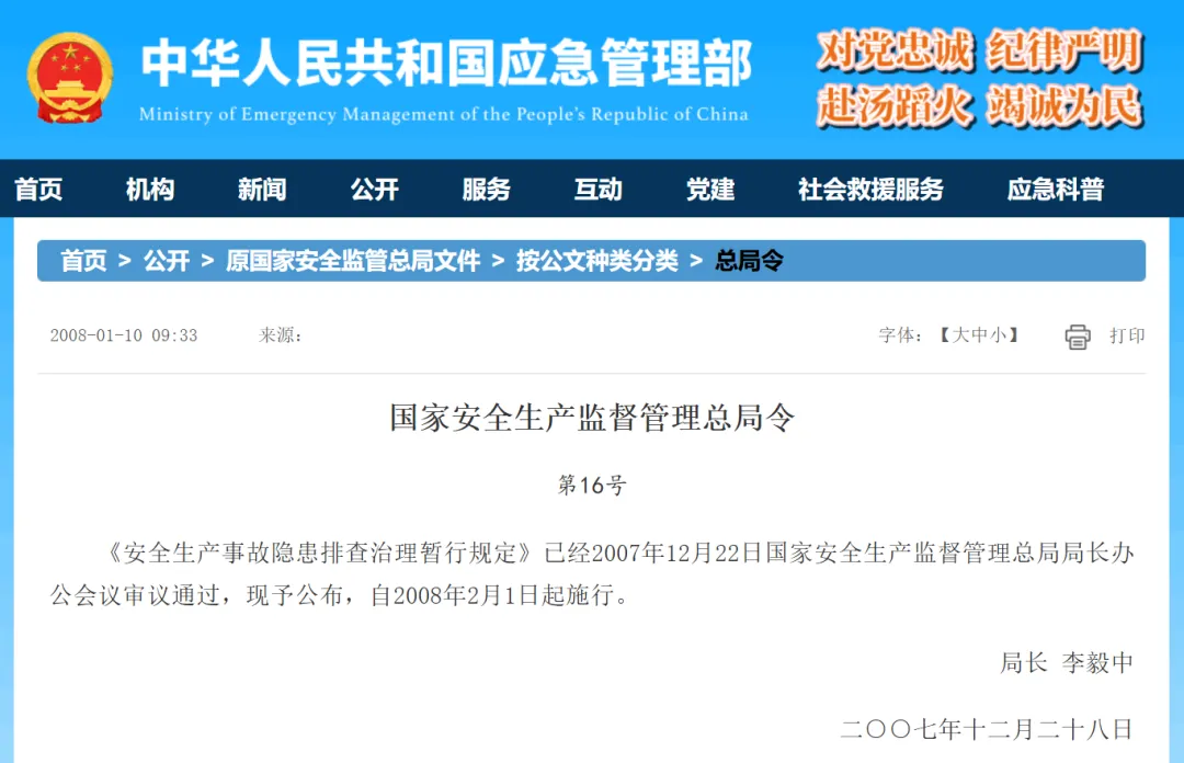 同时该规定对事故隐患分类进行了明确的描述,即为一般事故隐患和重大事故隐患。重大事故隐患各行业主管部门均在近期发布了不同行业的重大事故隐患判定标准,不再赘述。