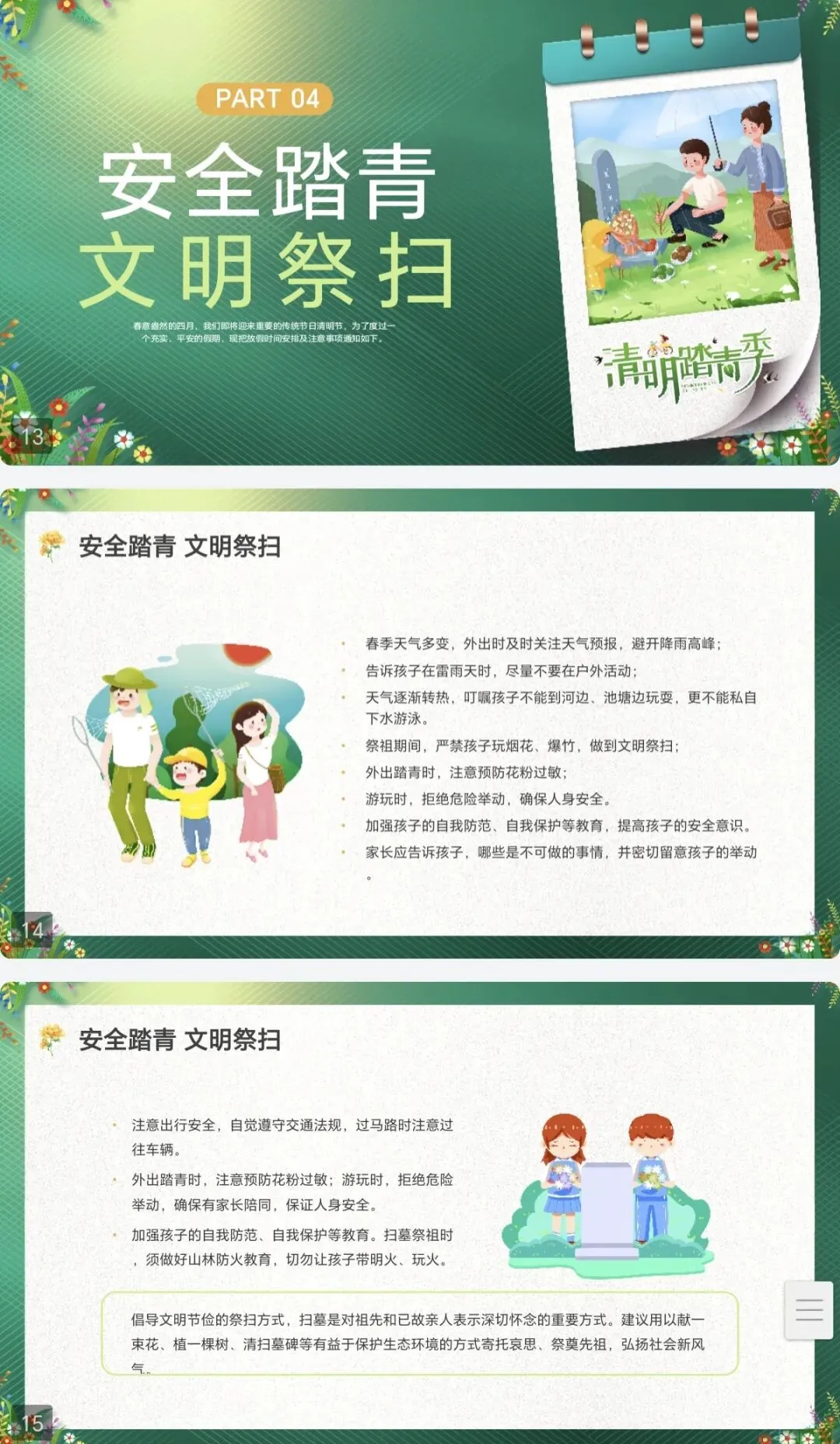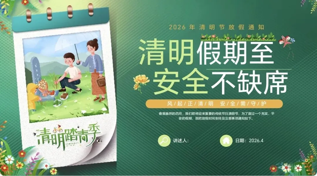 各位老师,清明假期快到了,安全班会又得安排上。往年我都是自己吭哧吭哧做PPT,找图片、排文字、凑内容,弄完一两个晚上就没了。今年我拿到一份现成的,觉得真心不错,分享给大家。