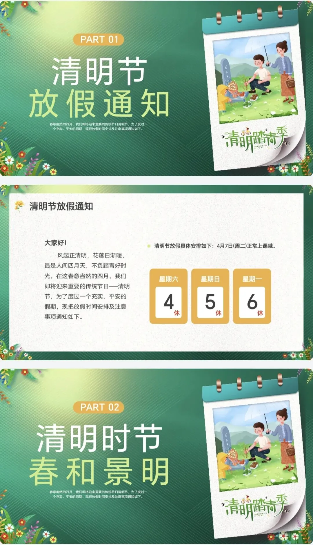不是干巴巴说“清明节放假”,而是加了踏青、祭祖、插柳、吃青团这几个传统习俗,班会课上可以顺便给孩子讲讲节日的来由,家长看到也觉得学校用心。