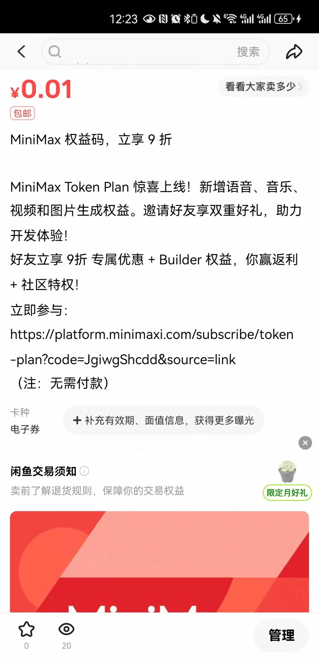 这事本身挺常规的,但我想了一下,与其发朋友圈刷屏,不如去闲鱼发个帖子:「MiniMax 邀请码,免费领,帮你省钱。」
