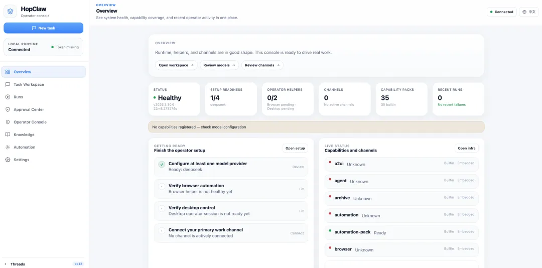 •核心能跑,二进制已经发布在 GitHub •部分渠道还在继续补深度 •Web 控制台能用但还需打磨 •文档还在完善中 •源码几周内开放,现在先体验二进制