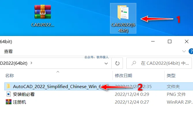 4、依次打开解压后的“CAD2022(64bit)”文件夹,“AutoCAD_2022_Simplified_Chinese_Win_64bit”文件夹。