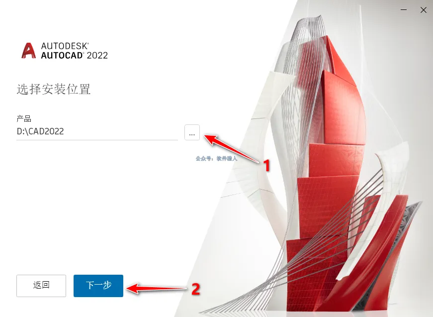 7、自定义自己想要的软件安装位置后下一步,注意安装路径不可出现中文。小编这里在D盘中新建了名为CAD2022的文件夹,并将安装位置设置在该文件夹下。