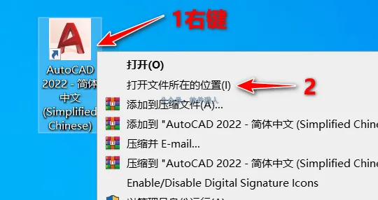 11、在桌面找到CAD2022快捷启动方式,右键它选择打开文件所在位置。