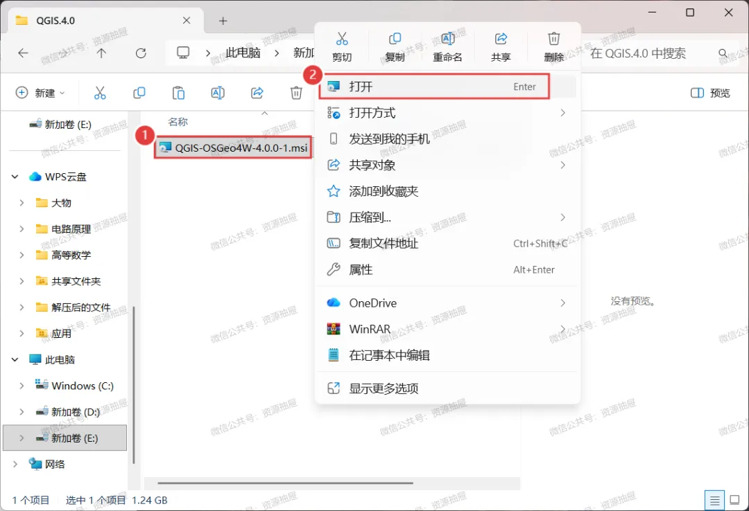 5.鼠标左键选中[QGIS-OSGeo4W-4.0.0-1.msi],再右键选择[打开]