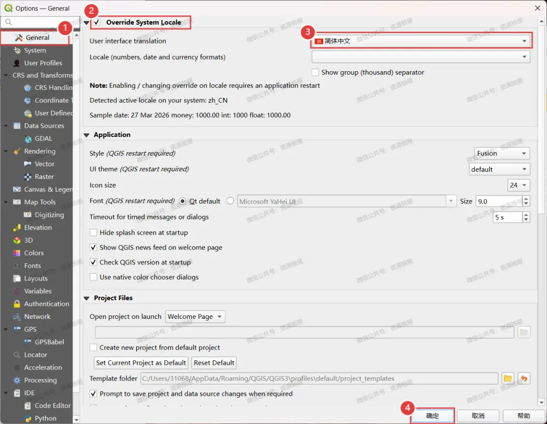 18.点击[General],勾选[Override System Locale],红标3处选择[简体中文],点击[确定]