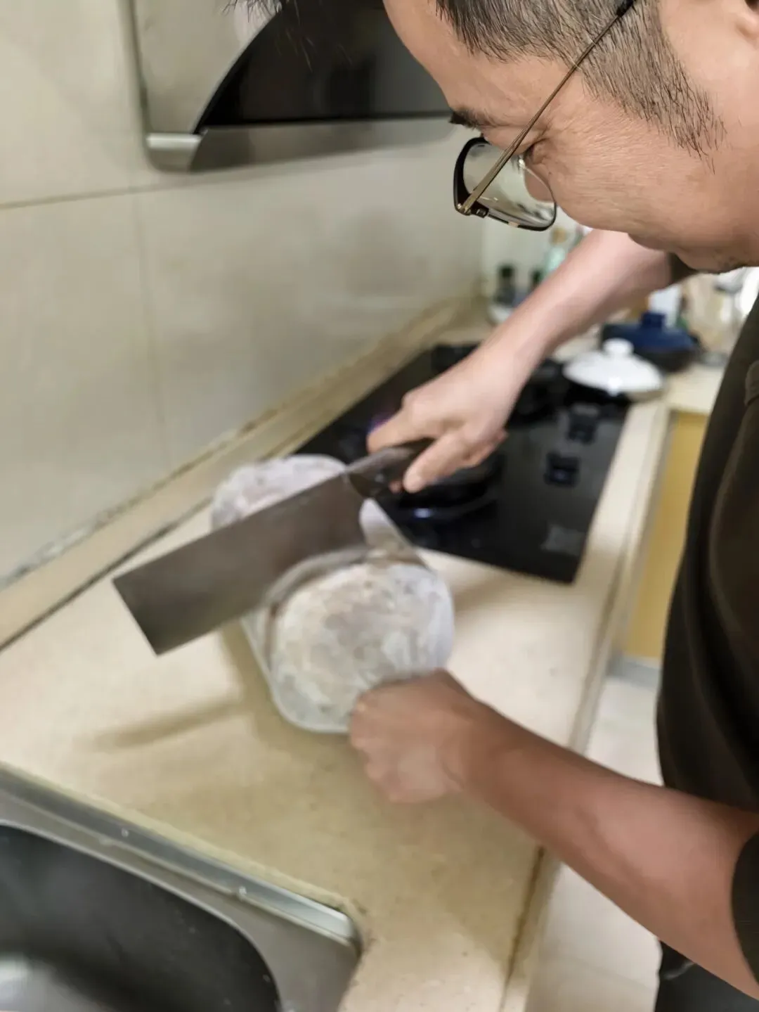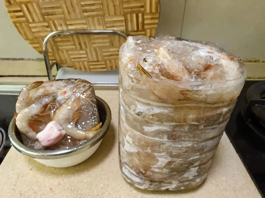 油桶里灌满了清水,虾冻成一块透明的冰,连虾须都好好的。她当场给我演示——菜刀架在灶上烧热,沿着桶身划一圈,塑料一缩,冰砖整个滑出来,一滴水没洒。她擦着手上的水,挺高兴的。